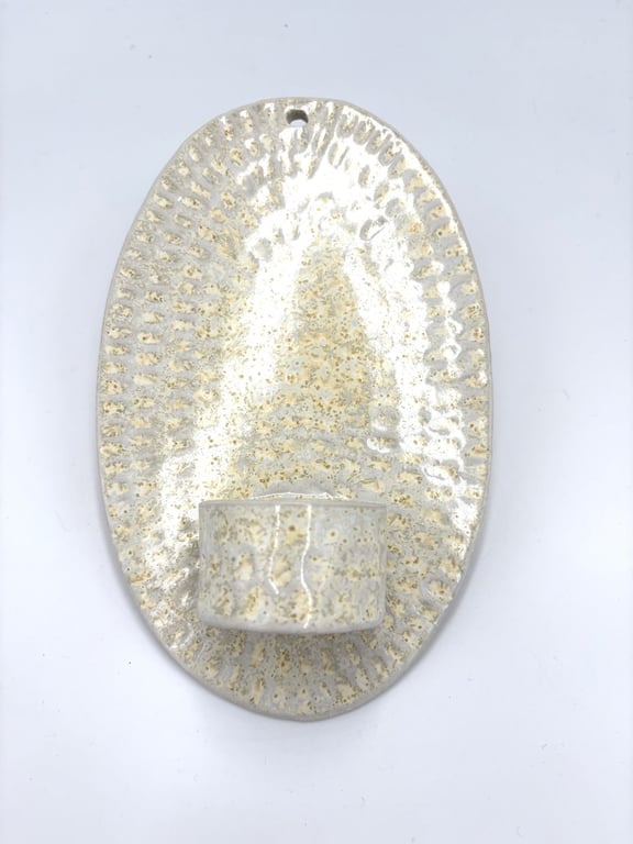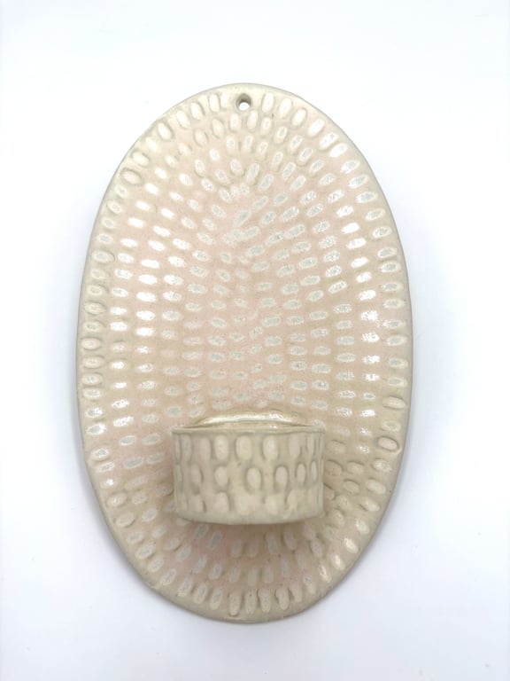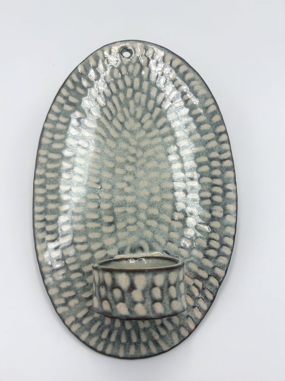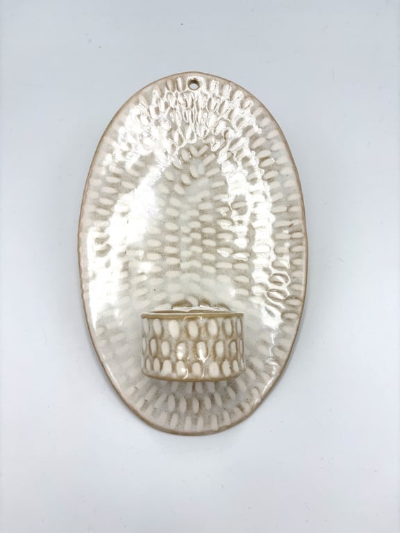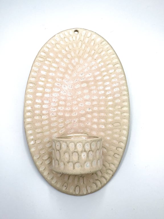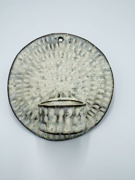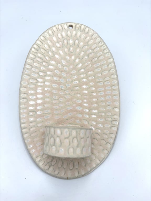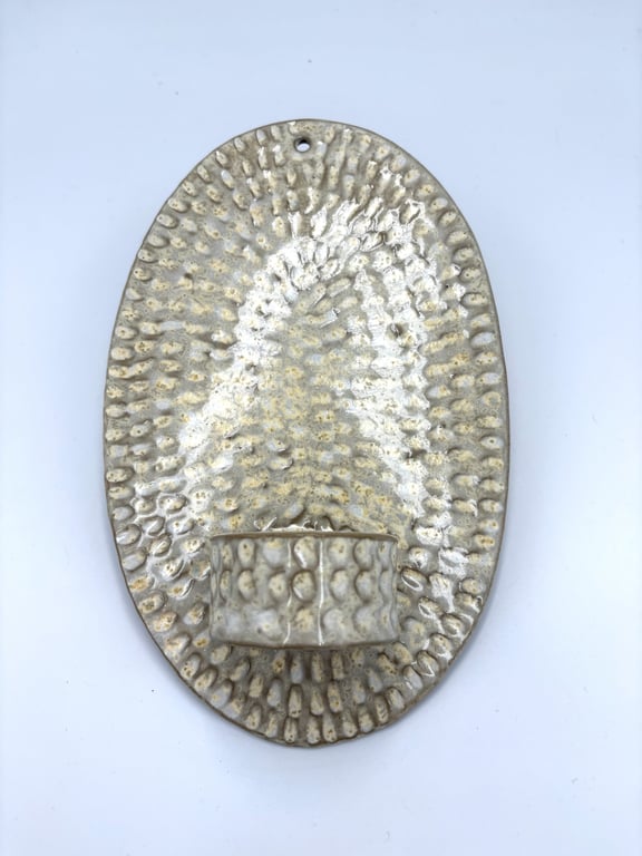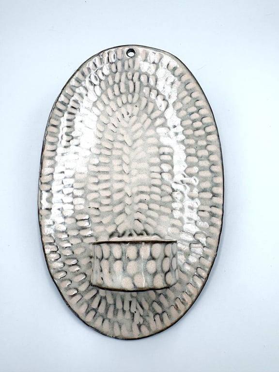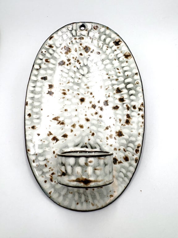Rund keramisk vægholder til fyrfadslys med tekstureret, prikket mønster i hvide og grå nuancer.
