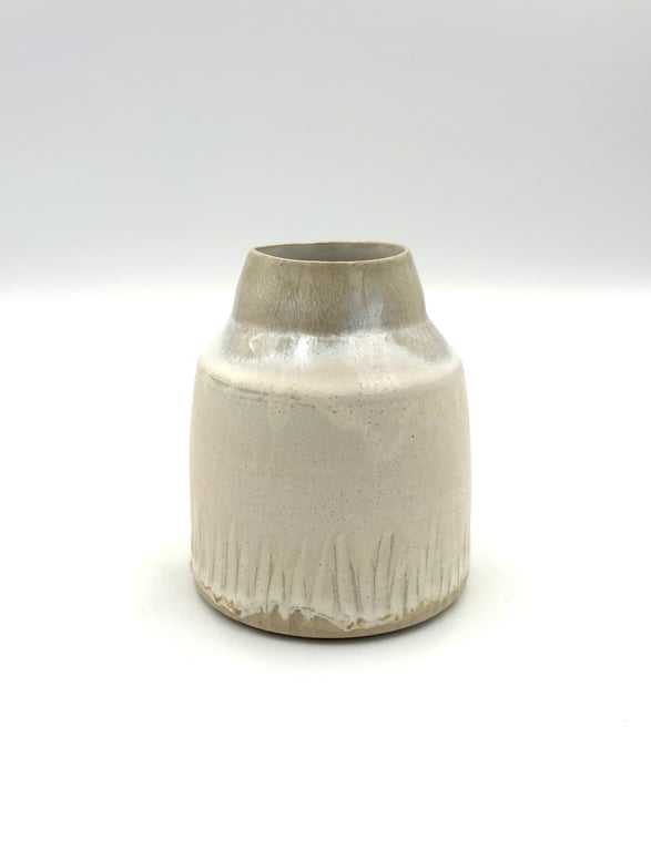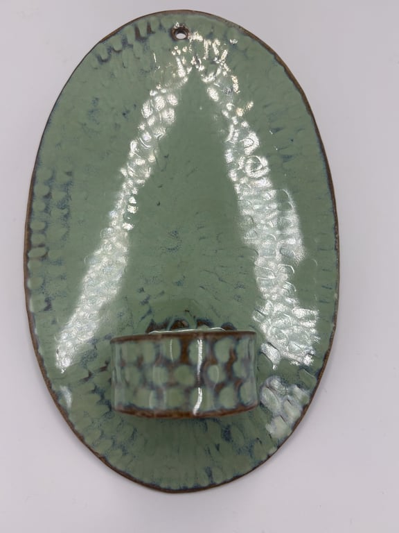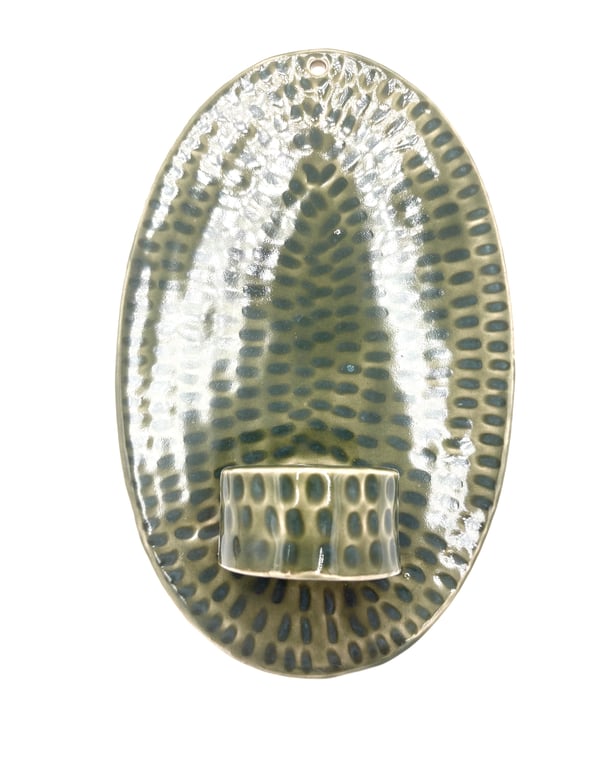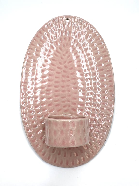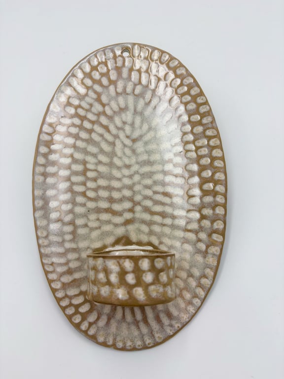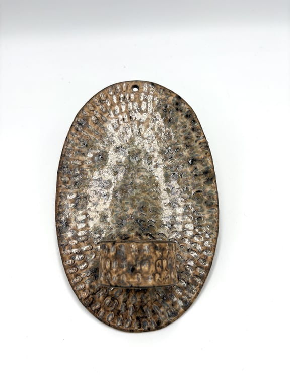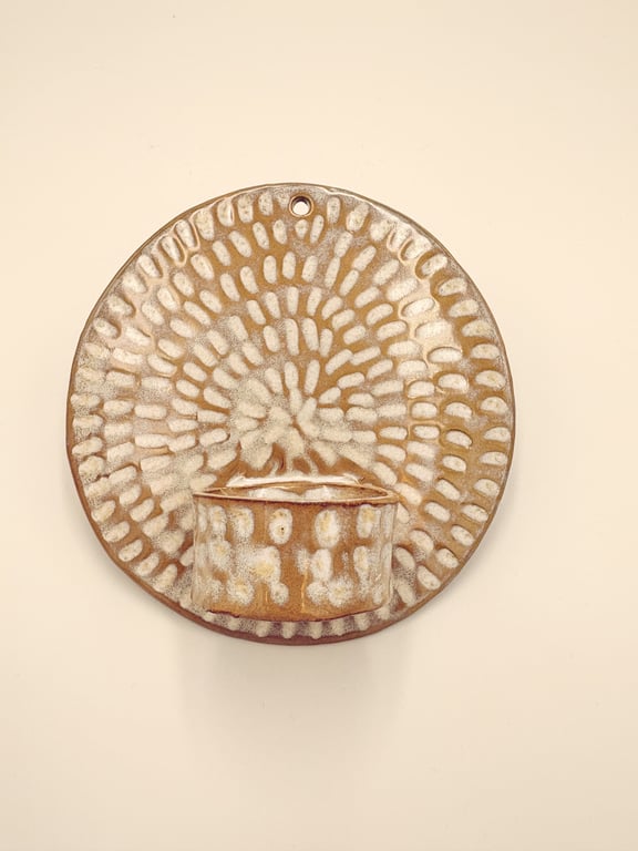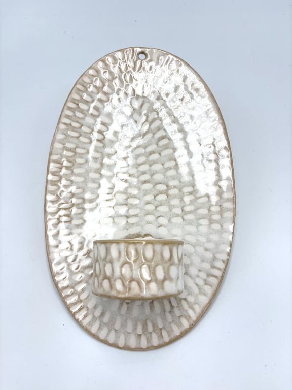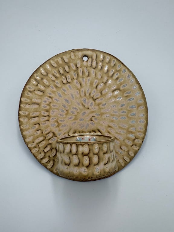 Rund keramisk vægholder til fyrfadslys med tekstureret, prikket mønster i hvide og grå nuancer.